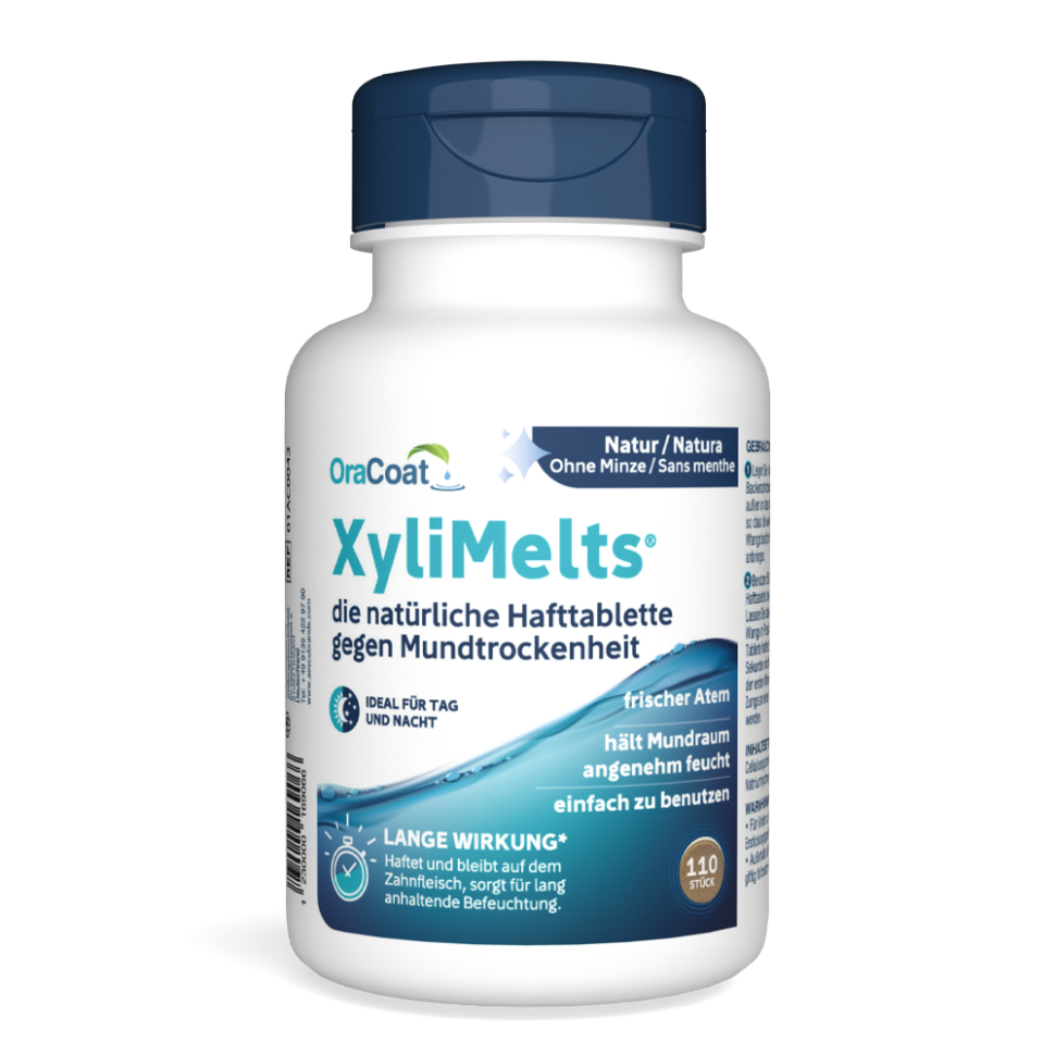 Aber genau diese fehlende Depotwirkung lösen die Hafttabletten von XyliMelts! Sie sind fest an einer Stelle im Mundraum verankert und produzieren dort einen kontinuierlichen Fluss aus ihren Inhaltsstoffen; dieser legt sich als dünner Film über die Schleimhäute und hält sie feucht bzw. regt die Speicheldrüsen anhaltend zur Speichelproduktion an. Die Hafttablette löst sich innerhalb von 4-6 h auf (abhängig von den Bedingungen im Mundraum) und sorgt in dieser Zeit für ein dauerhaft feuchtes Klima im Mundraum.